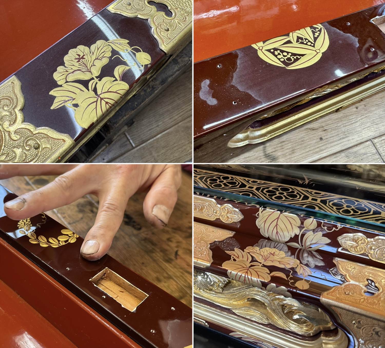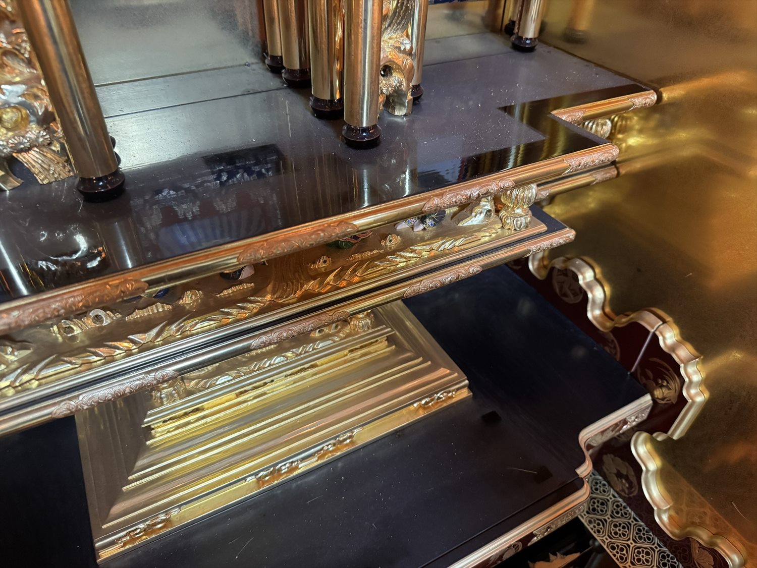 1日目は現場での徹底的な手入れと部材の預かり、2日目には不足していた仏具の調達と配置を完了させました。かつての自分の塗りに触れながらの作業は、当時の未熟さや情熱を思い出し、初心に帰るような新鮮な心持ちでした。