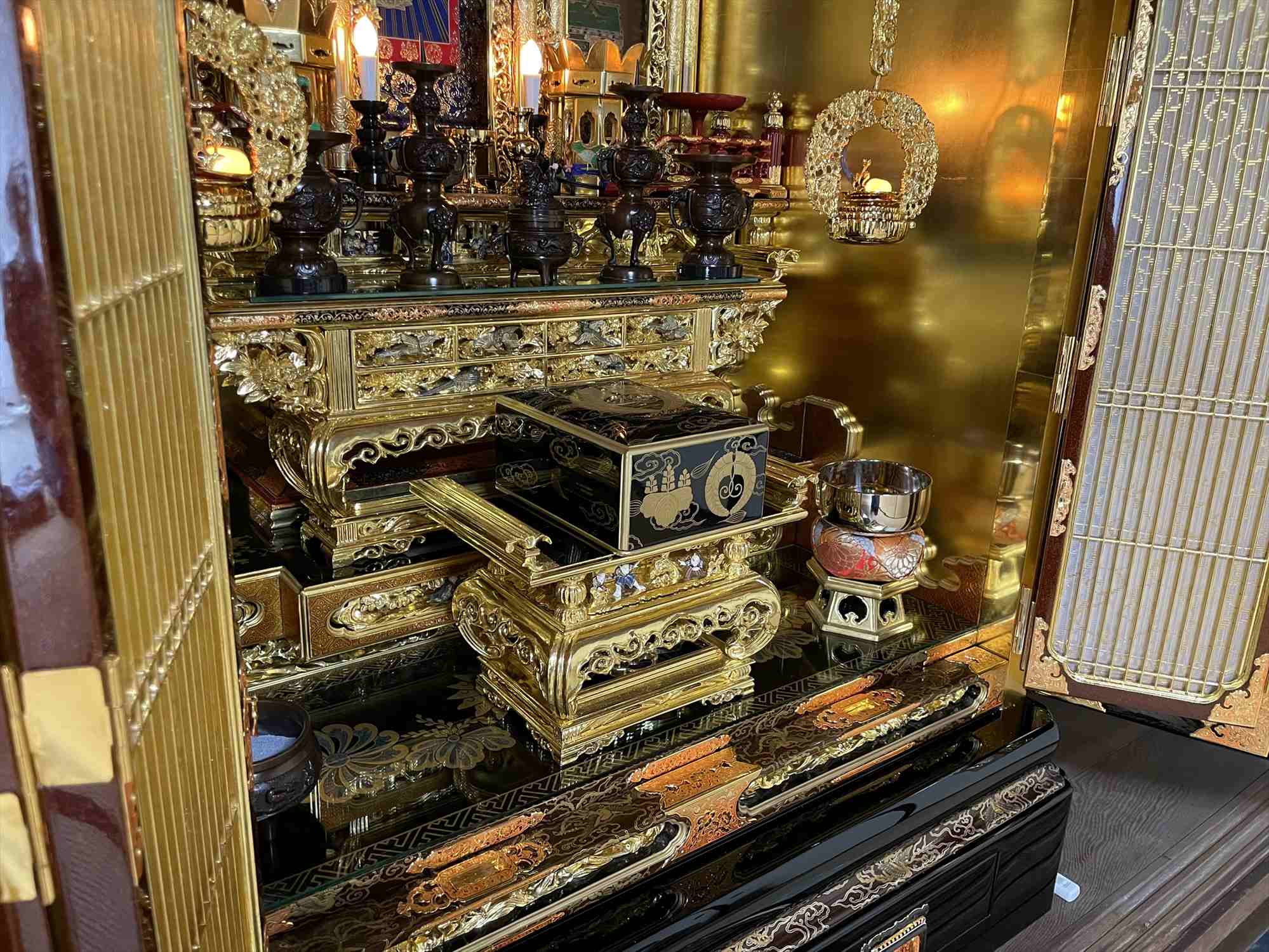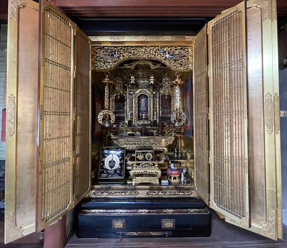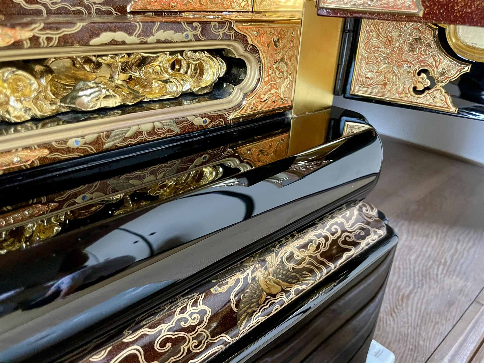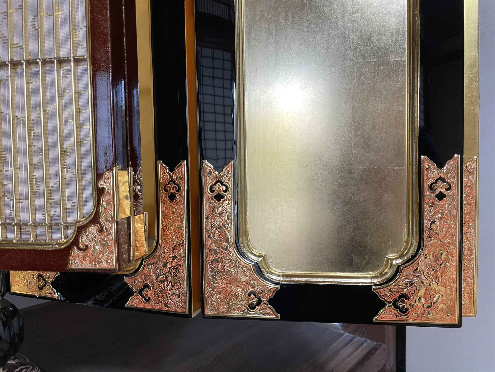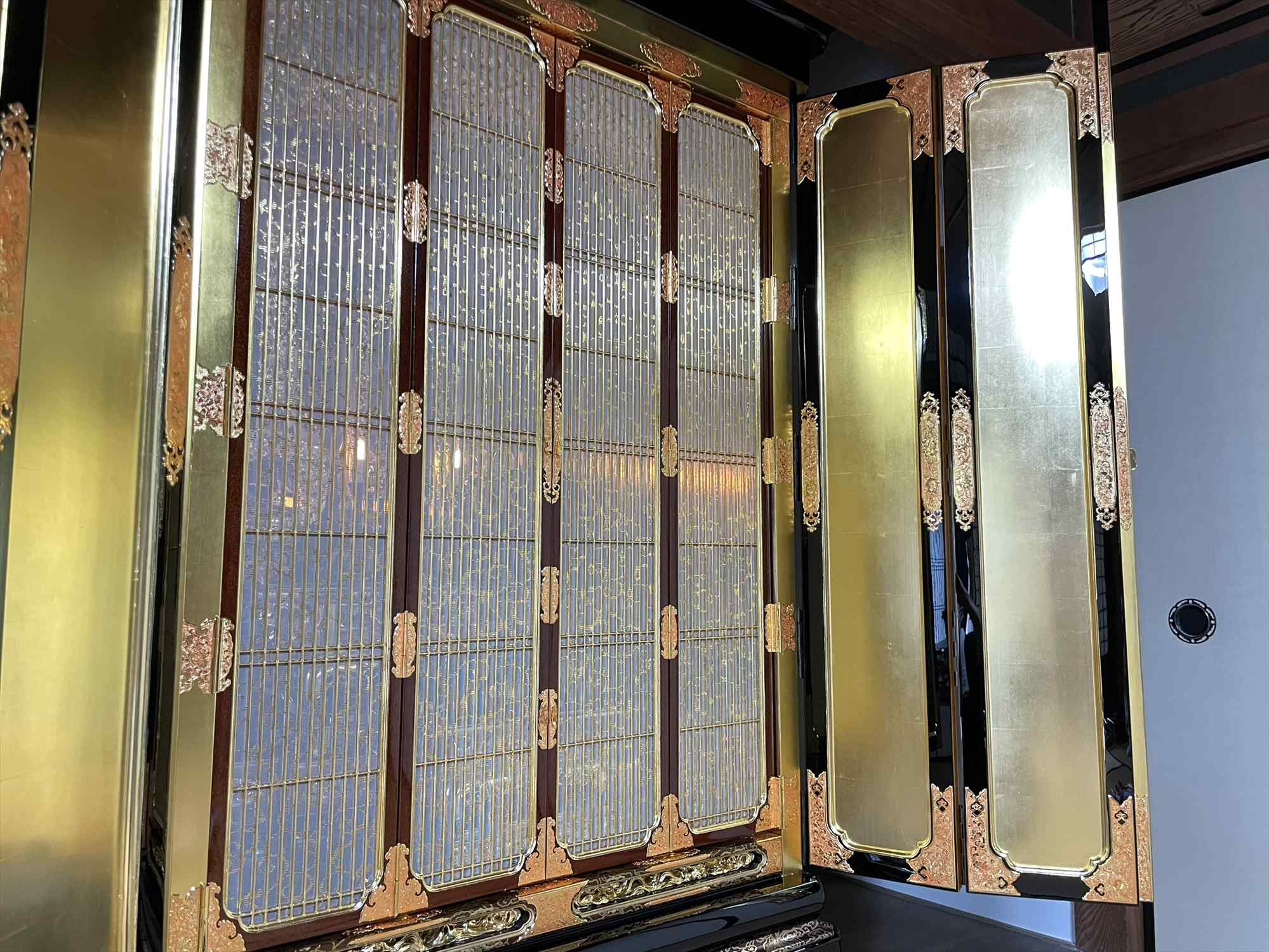 今回の修復では、濡れたような深い光沢を放つ「漆塗り蝋色(ろいろ)仕上げ」に加え、壇周りには金箔の上に透き漆を重ねる「白檀(びゃくだん)塗り」を多用し、気品ある輝きを再現いたしました。