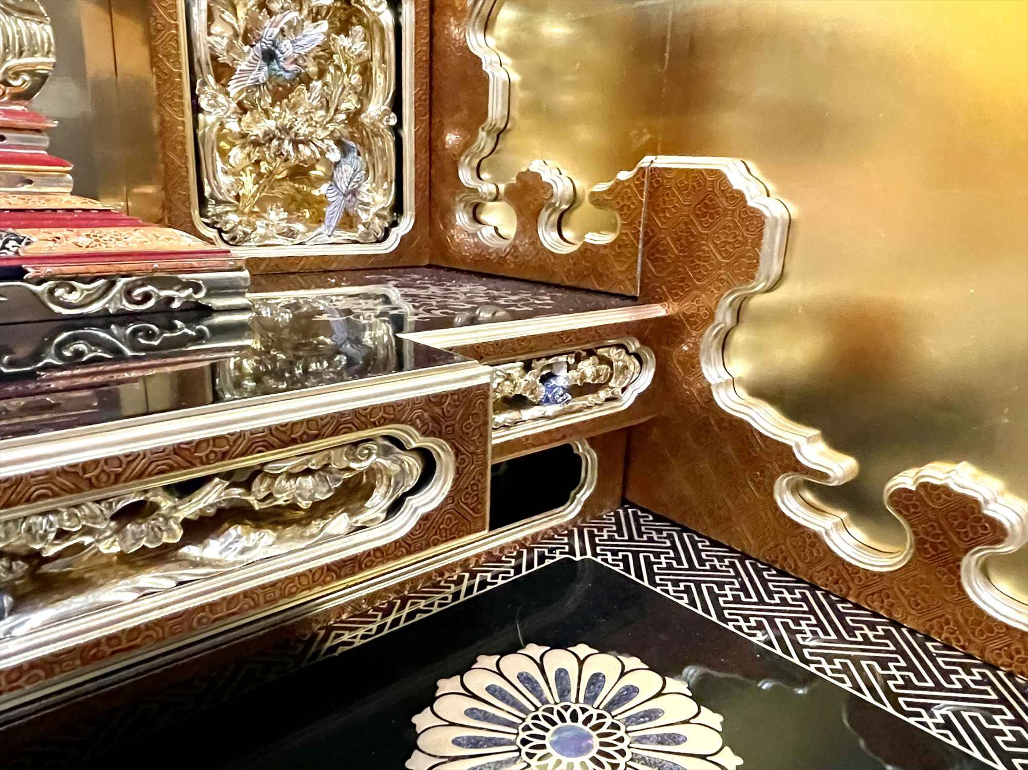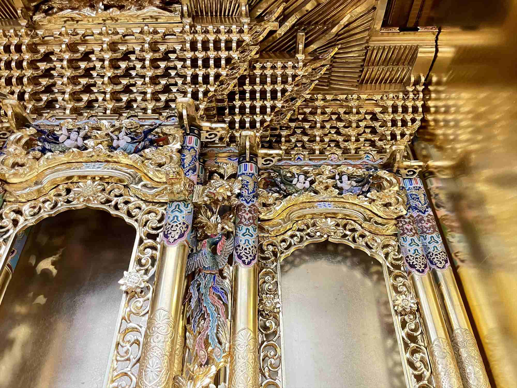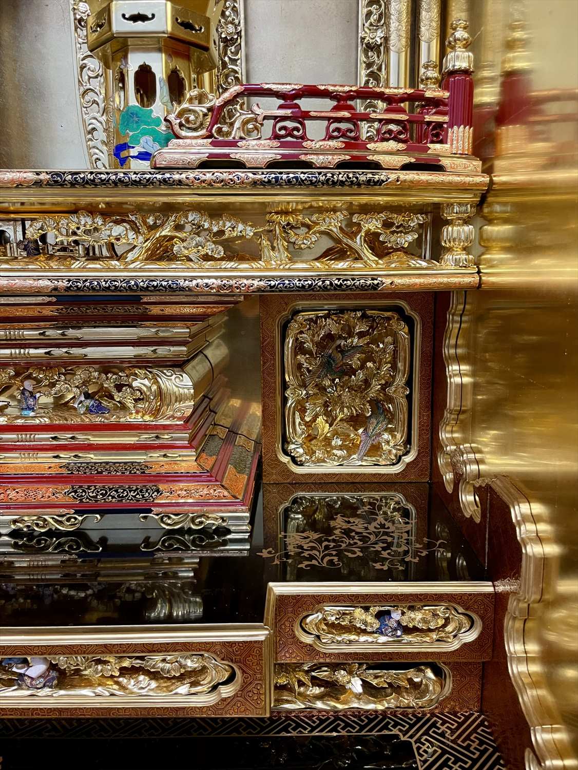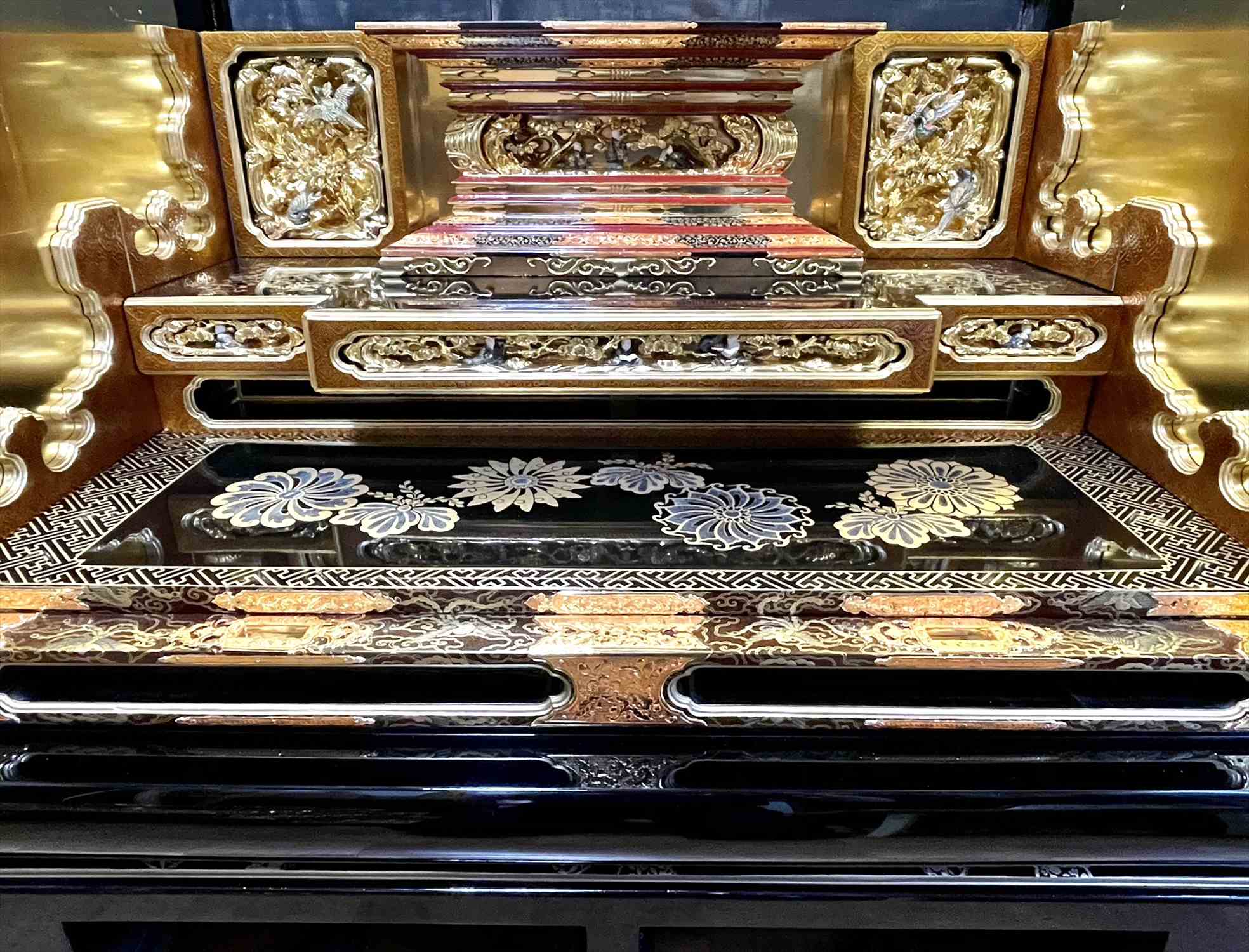 今回の修復では、濡れたような深い光沢を放つ「漆塗り蝋色(ろいろ)仕上げ」に加え、壇周りには金箔の上に透き漆を重ねる「白檀(びゃくだん)塗り」を多用し、気品ある輝きを再現いたしました。